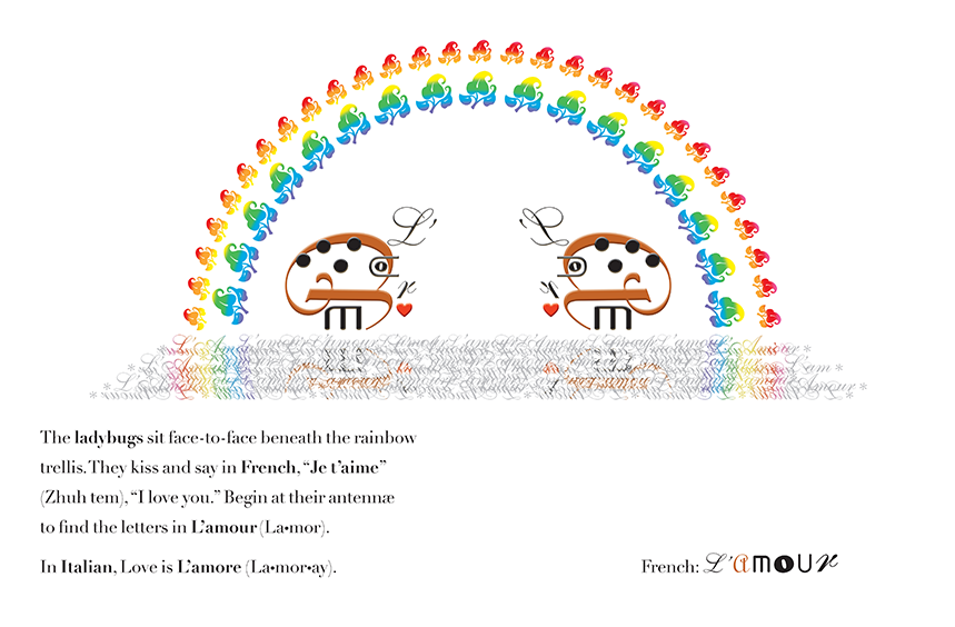 From Czech to Korean to American Sign Language, here are sixteen ways to say “love” in this ingeniously, and gorgeously, designed and illustrated picture book. Children and adults will delight in the way Cundy shapes the letters from and with animals. The Amharic word that makes a cheetah's face, the ladybugs made from the French word “l’amour,” the Japanese koy catching a valentine — open your world to all these ways to say “love” (pronunciations included).