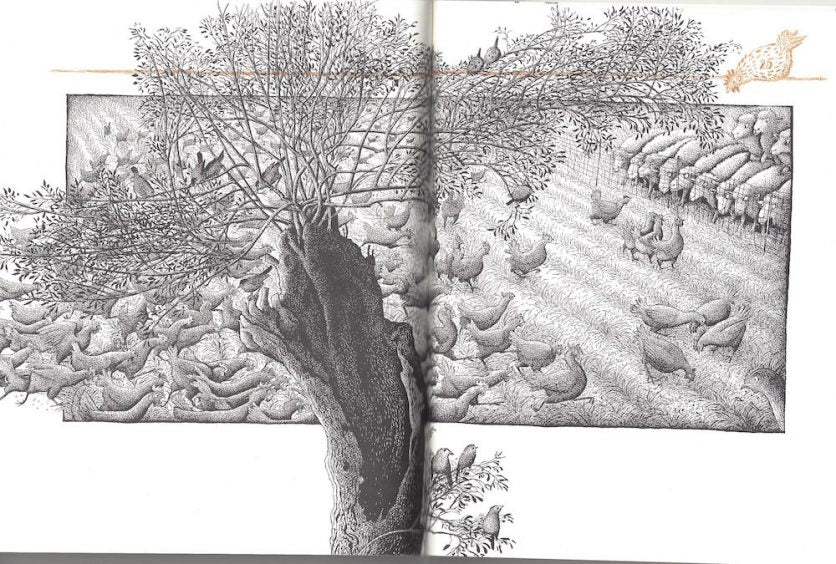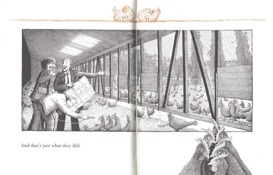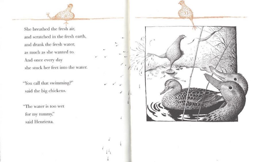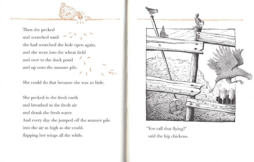 Our heroine is no fool; she knows her limitations, but doesn't let them destroy her ambitions, any more than she lets the hen house walls keep her a prisoner. And she's not above causing a little havoc along the way — once the other three thousand, three hundred thirty-three chickens find her escape route, chaos reigns in the barnyard, by the pond, and among the wheat fields.